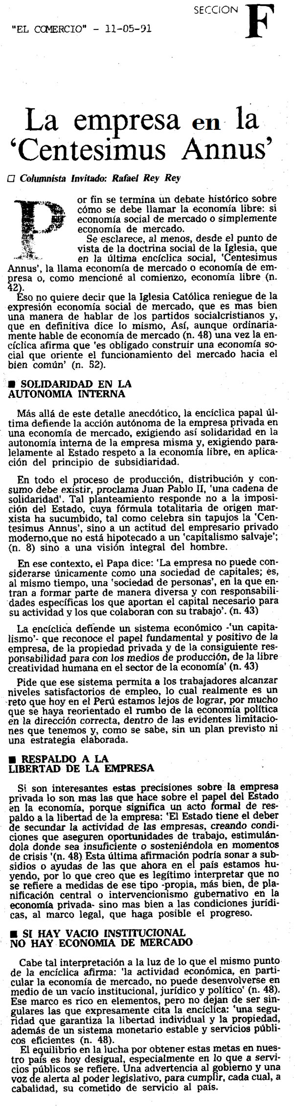 La empresa en la “Centesimus Annus” By Rafael Rey On 11 Mayo, 1991 In Economía de mercado, El Comercio, Iglesia y Estado Previous Quedarse en el país Next La política, instrumento limpio al servicio del país