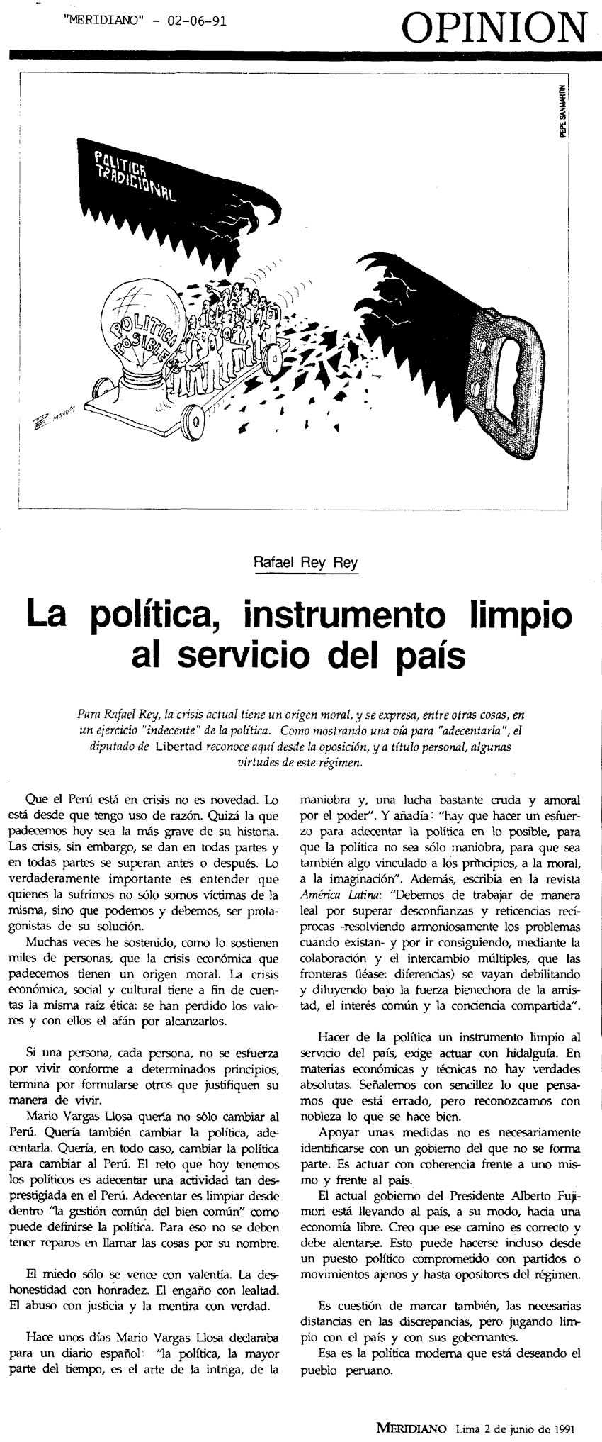 La política, instrumento limpio al servicio del país By Rafael Rey On 2 Junio, 1991 In Bien común, Revista Meridiano Previous La empresa en la “Centesimus Annus” Next En nombre de Rodrigo Franco