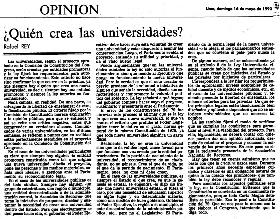 ¿Quién crea las universidades? By Rafael Rey On 16 Mayo, 1993 In Educación, El Comercio Previous El Poder Judicial, primer poder del Estado Next Deber de la minoría parlamentaria