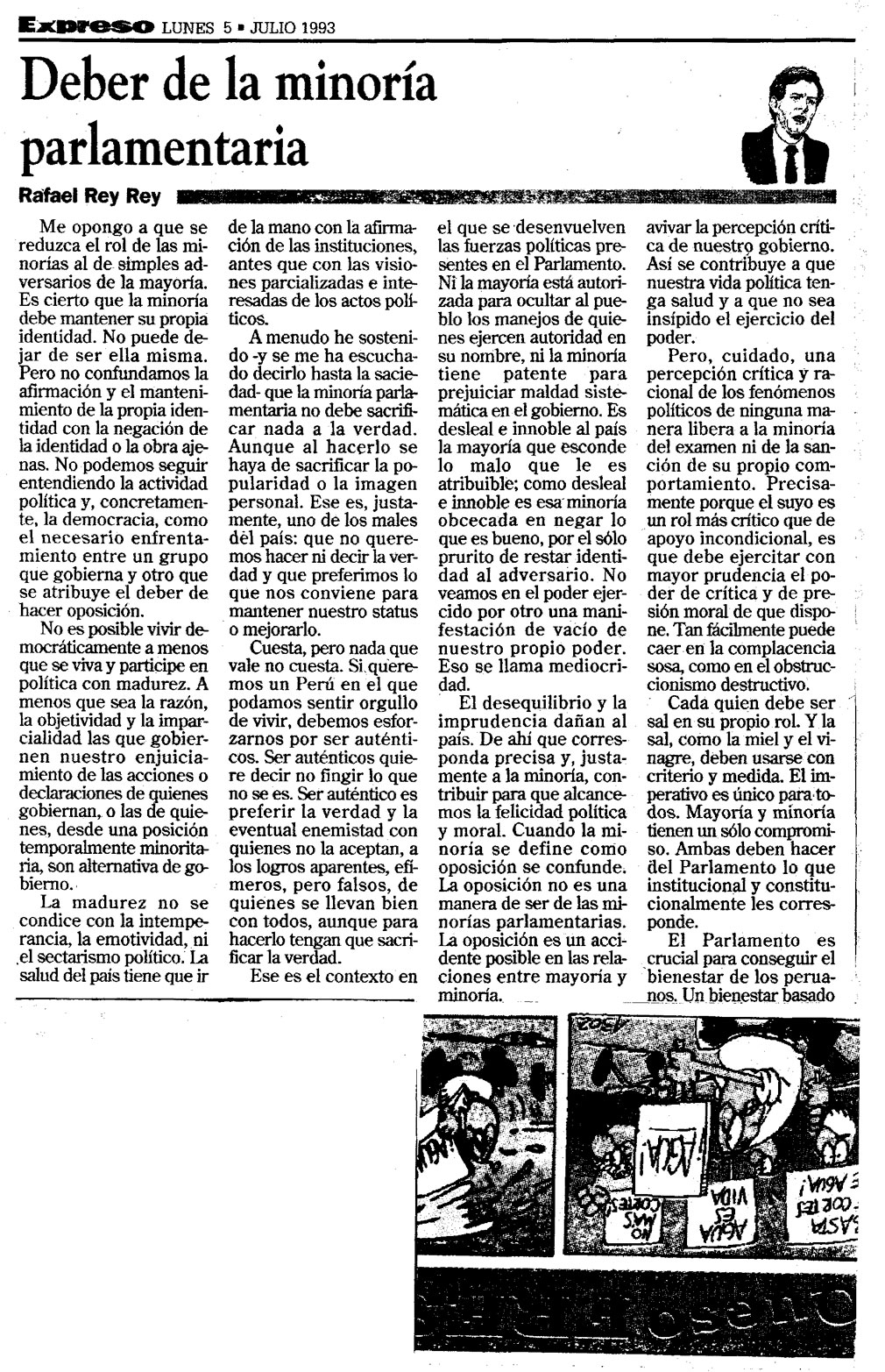 Deber de la minoría parlamentaria By Rafael Rey On 5 Julio, 1993 In Democracia, Expreso Previous ¿Quién crea las universidades? Next Renovación de la política