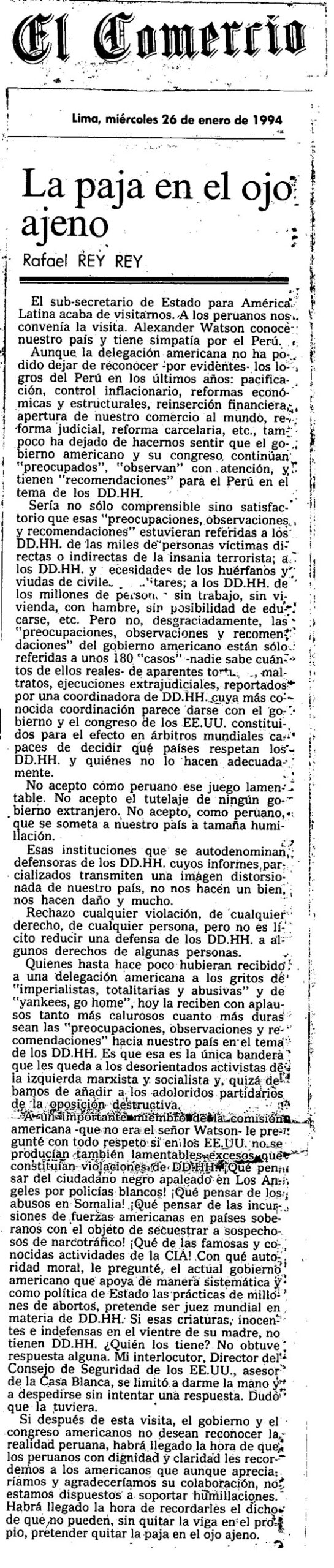 La paja en el ojo ajeno By Rafael Rey On 26 Enero, 1994 In El Comercio, Terrorismo y DDHH Previous Más y mejor educación para todos Next Ni los extranjeros les hacen caso