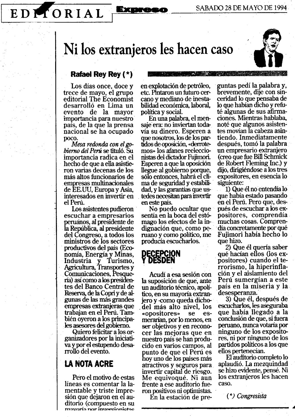 Ni los extranjeros les hacen caso By Rafael Rey On 28 Mayo, 1994 In Democracia, Expreso Previous La paja en el ojo ajeno Next Perú y la Conferencia de El Cairo