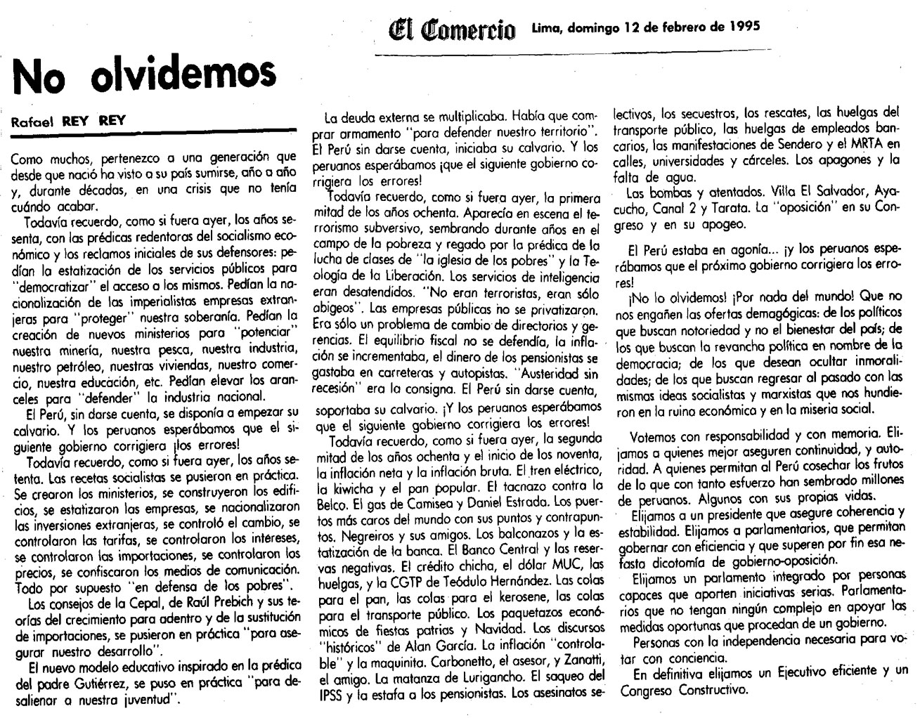 No olvidemos By Rafael Rey On 12 Febrero, 1995 In Democracia, El Comercio Previous Defendamos la familia Next El pueblo peruano razona