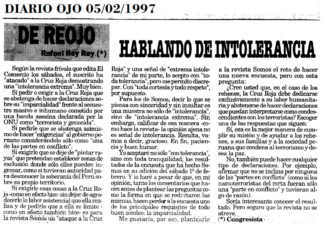 Hablando de intolerancia By Rafael Rey On 5 Febrero, 1997 In Bien común, Ojo Previous Dos comentarios Next Hechos dolorosos