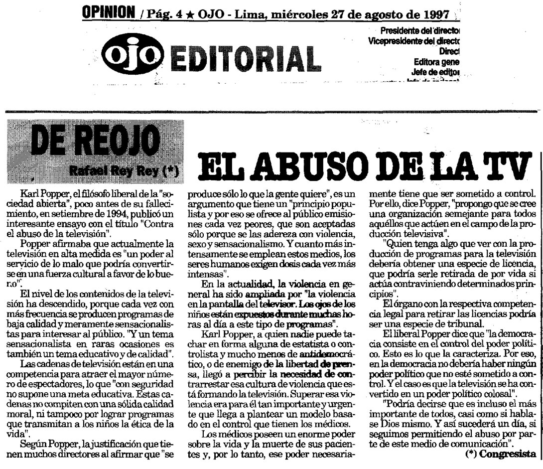 El abuso de la TV By Rafael Rey On 27 Agosto, 1997 In Libertad de expresión, Ojo Previous Igual que los nazis Next Corrupción