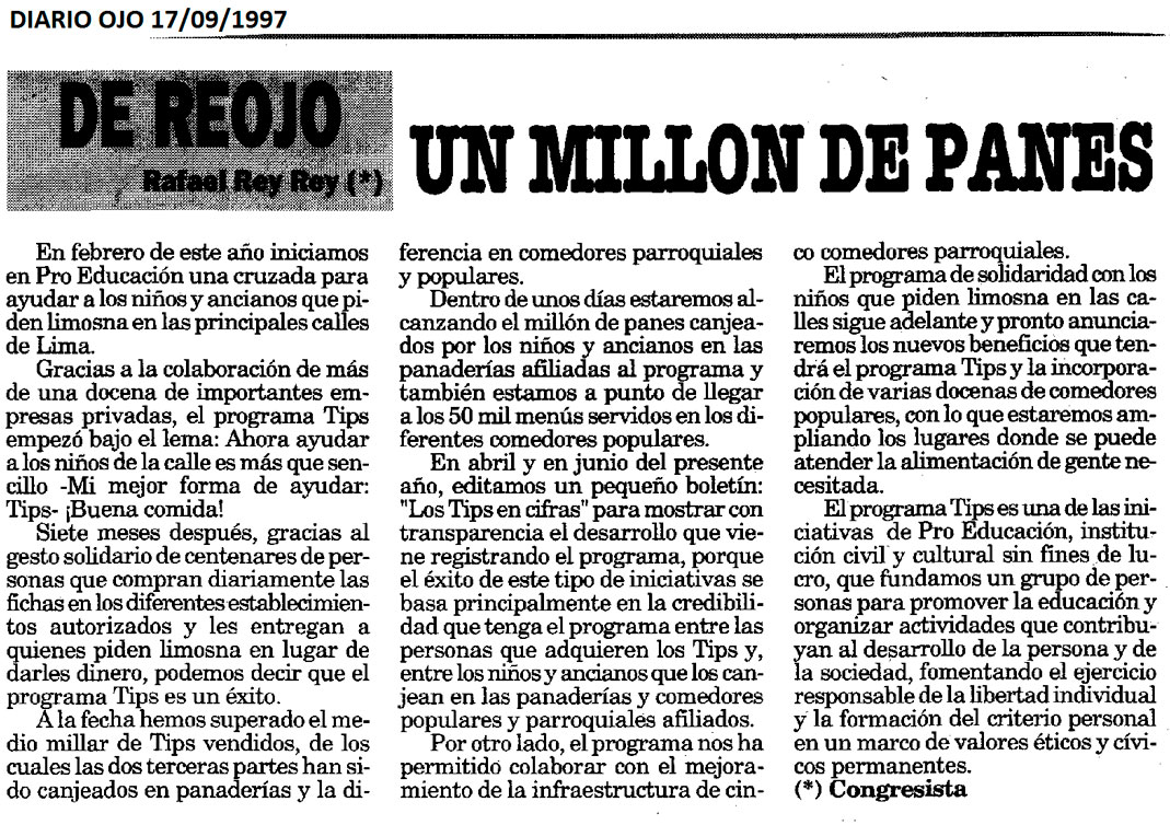 Un millón de panes By Rafael Rey On 17 Septiembre, 1997 In Bien común, Economía de mercado, Ojo Previous Carta de un civil a los militares Next Propiedad