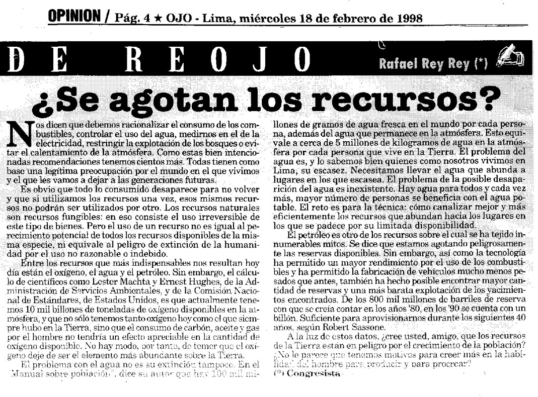 ¿Se agotan los recursos? By Rafael Rey On 18 Febrero, 1998 In Demografía, Medio Ambiente, Ojo Previous El error de Jaime de Althaus Next Más pruebas