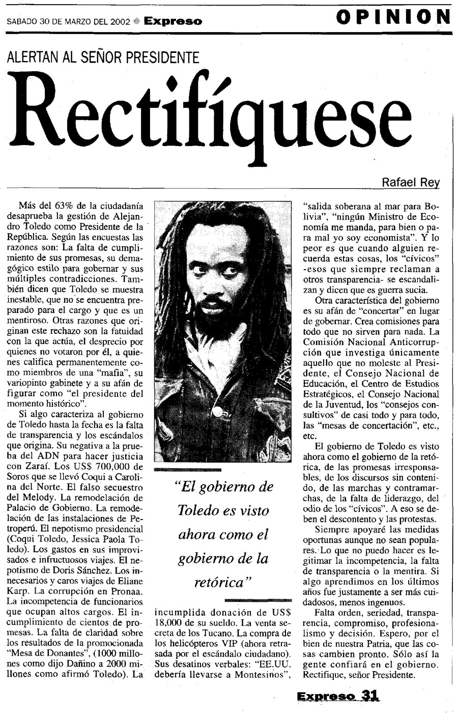 Rectifíquese By Rafael Rey On 30 Marzo, 2002 In Alejandro Toledo, Expreso Previous Demagogia Next Banquillo de ONG