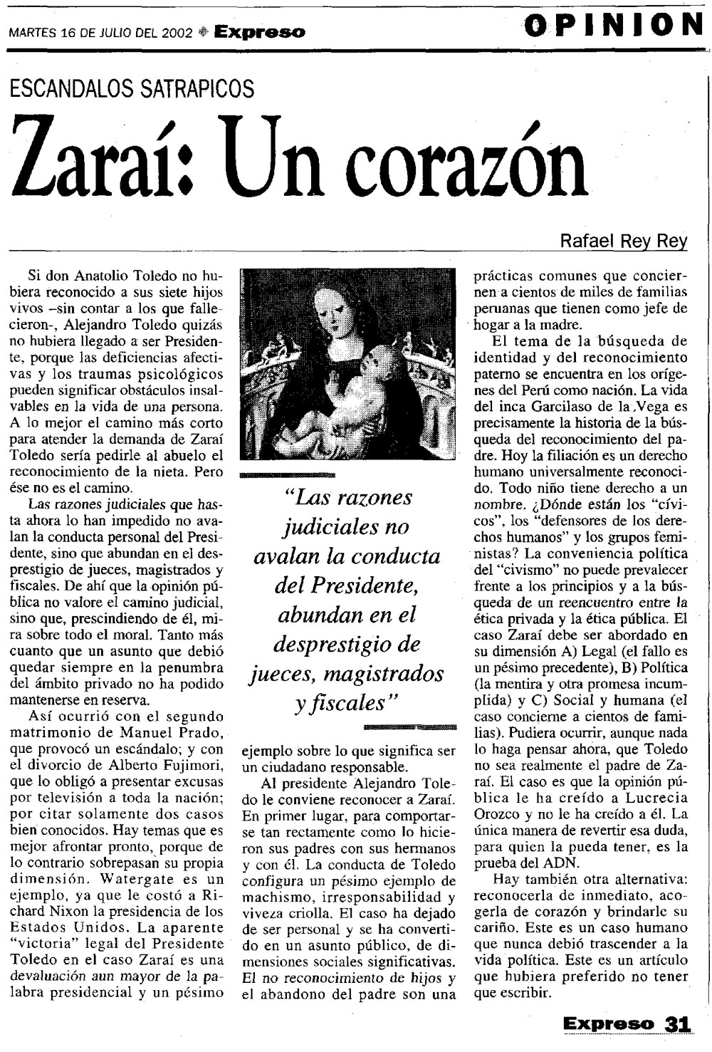 Zaraí: un corazón con rostro humano By Rafael Rey On 16 Julio, 2002 In Alejandro Toledo, Expreso Previous Banquillo de ONG Next Más empleo. Seamos consecuentes