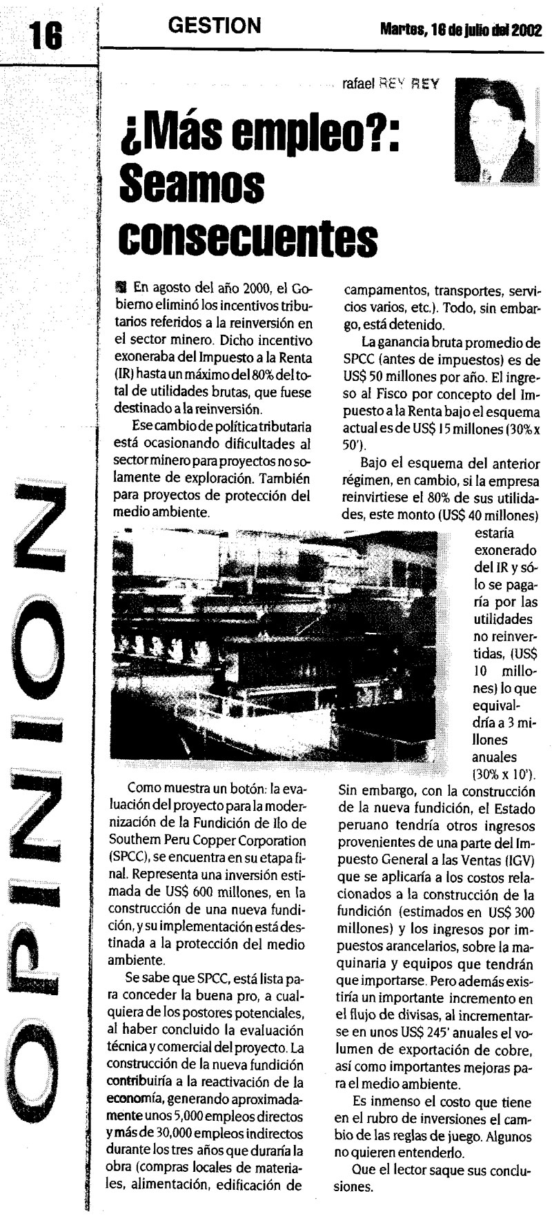 Más empleo. Seamos consecuentes By Rafael Rey On 18 Julio, 2002 In Economía de mercado, Gestión Previous Zaraí: un corazón con rostro humano Next Y Toledo no cumplió