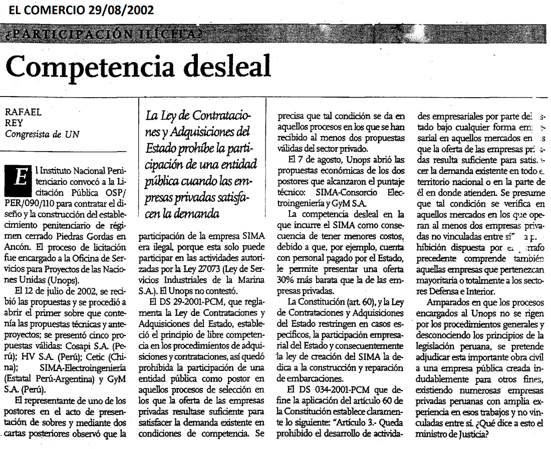 Competencia desleal By Rafael Rey On 29 Agosto, 2002 In Economía de mercado, El Comercio Previous Herencia de Alan Wagner Next Triste Comisión