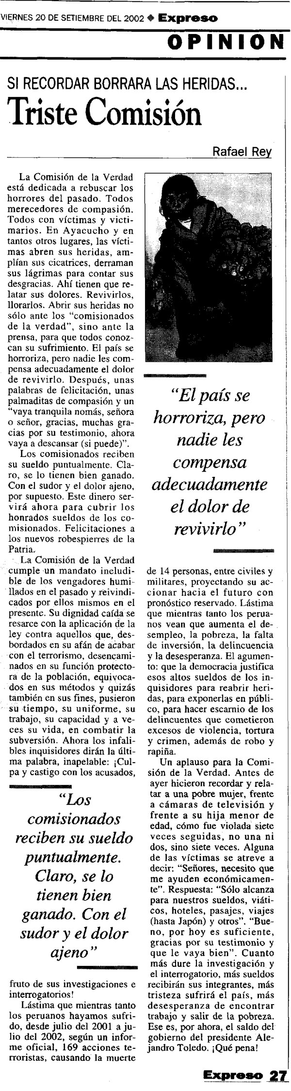 Triste Comisión By Rafael Rey On 20 Septiembre, 2002 In Comisión de la Verdad (CVR), Expreso Previous Competencia desleal Next Urgente, ley que debe ser observada