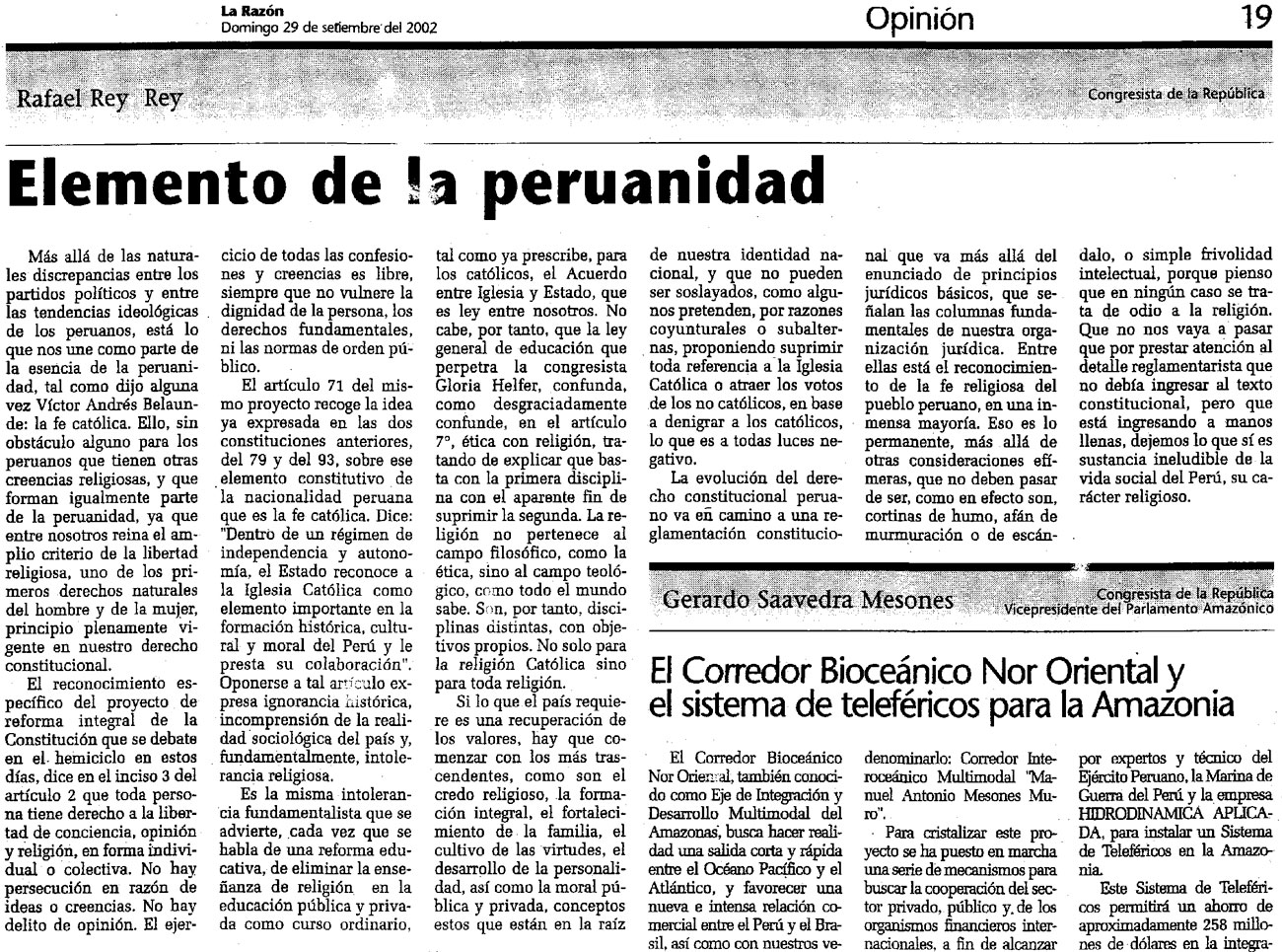 Elemento de Peruanidad By Rafael Rey On 29 Septiembre, 2002 In Iglesia y Estado, La Razón Previous Urgente, ley que debe ser observada Next Circo de Octubre