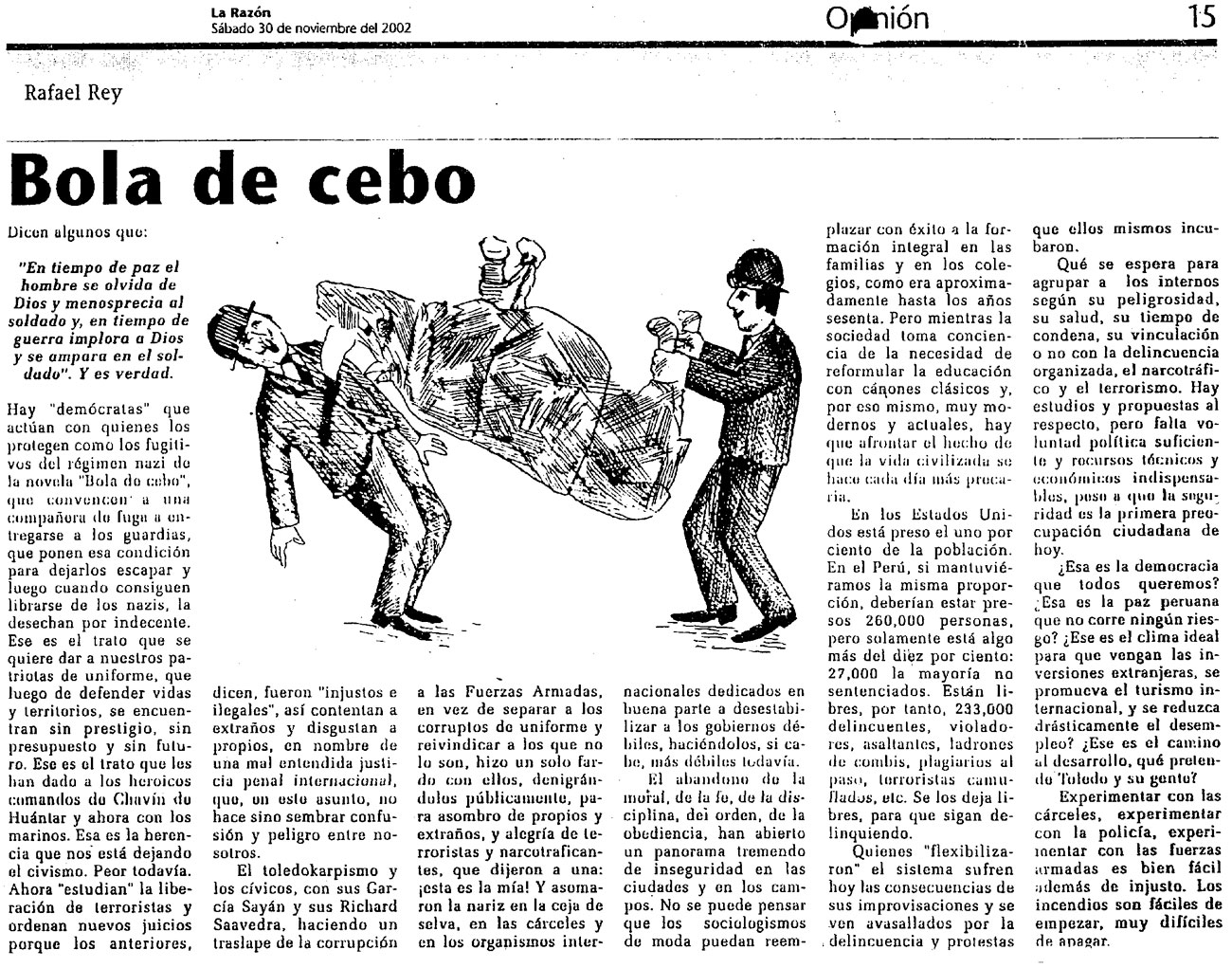 Bola de cebo By Rafael Rey On 30 Noviembre, 2002 In La Razón, Terrorismo y FFAA Previous La hora de Lima Next Populistas