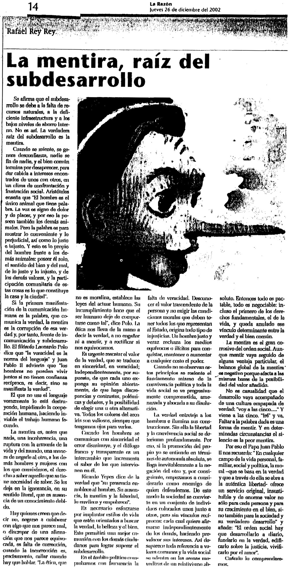 La mentira, raíz del subdesarrollo By Rafael Rey On 26 Diciembre, 2002 In La Razón, Libertad de expresión Previous Conducta responsable Next Proteger la vida