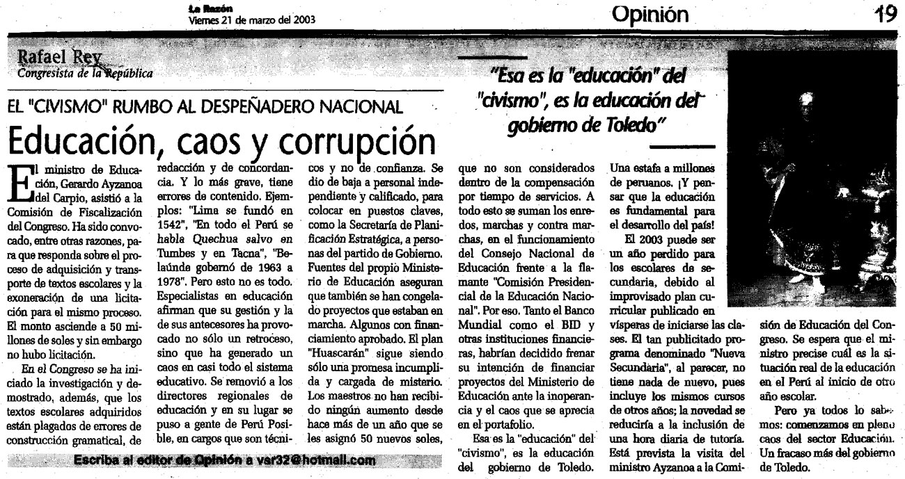 Educación, caos y corrupción By Rafael Rey On 21 Marzo, 2003 In Educación, La Razón Previous Perú y Chile Next La justicia tarda pero llega
