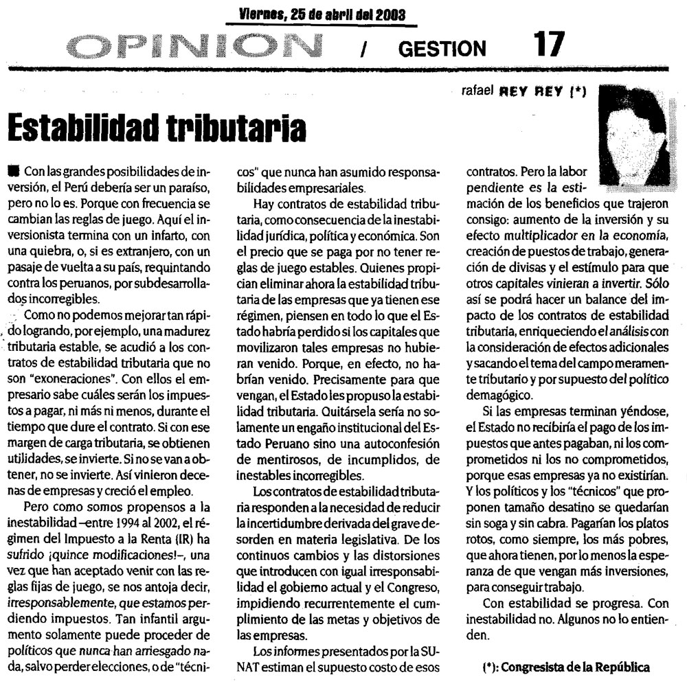 Estabilidad tributaria By Rafael Rey On 25 Abril, 2003 In Gestión, Política Tributaria Previous La palabra como arma Next El concepto de educación