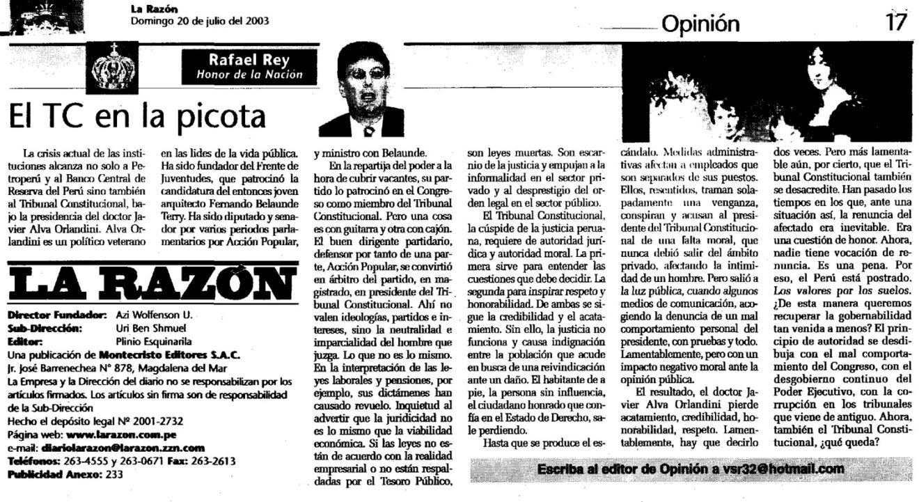 El TC en la picota By Rafael Rey On 20 Julio, 2003 In La Razón, Realidad Previous Peligro para la salud Next Valentía y decisión