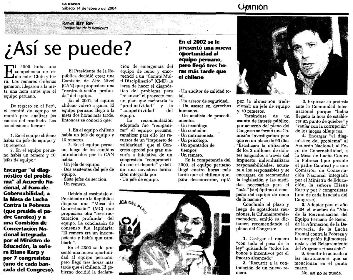 ¿Así se puede? By Rafael Rey On 14 Febrero, 2004 In Alejandro Toledo, Incoherencias, La Razón Previous Zaraí, dignidad y democracia Next El ITF y la Agricultura