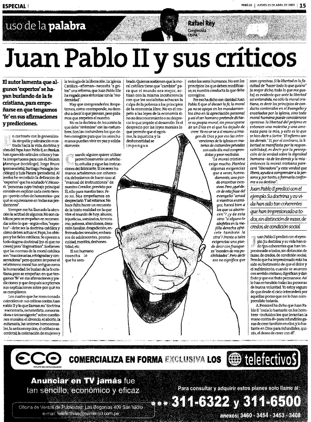 Juan Pablo II y sus críticos By Rafael Rey On 21 Abril, 2005 In Iglesia y Estado, Perú 21 Previous ¿Número o calidad? Next Respuesta a Nelson Manrique