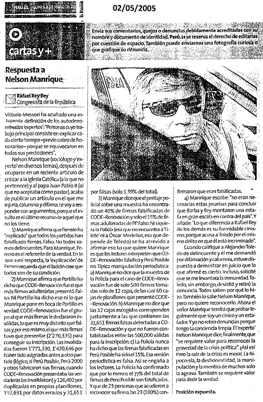 Respuesta a Nelson Manrique By Rafael Rey On 2 Mayo, 2005 In Calumnias, Perú 21 Previous Juan Pablo II y sus críticos Next El discurso de Toledo