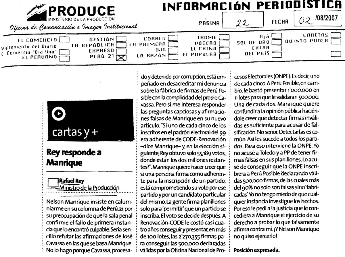 Rey responde a Manrique By Rafael Rey On 2 Agosto, 2007 In Calumnias, Nelson Manrique, Perú 21 Previous Enrique Chirinos Soto Next A cambiar lo malo de la realidad