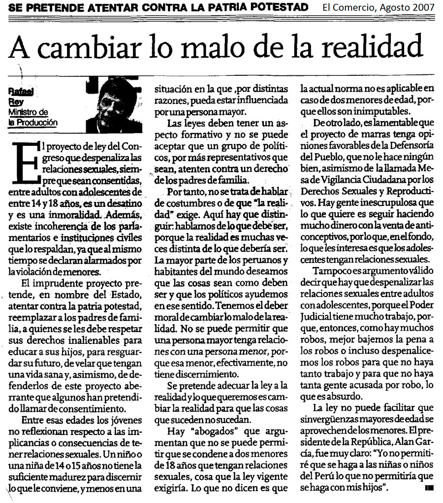 A cambiar lo malo de la realidad By Rafael Rey On 3 Agosto, 2007 In Corrupción, El Comercio, Incoherencias Previous Rey responde a Manrique Next ¿Cómo el perro del hortelano?