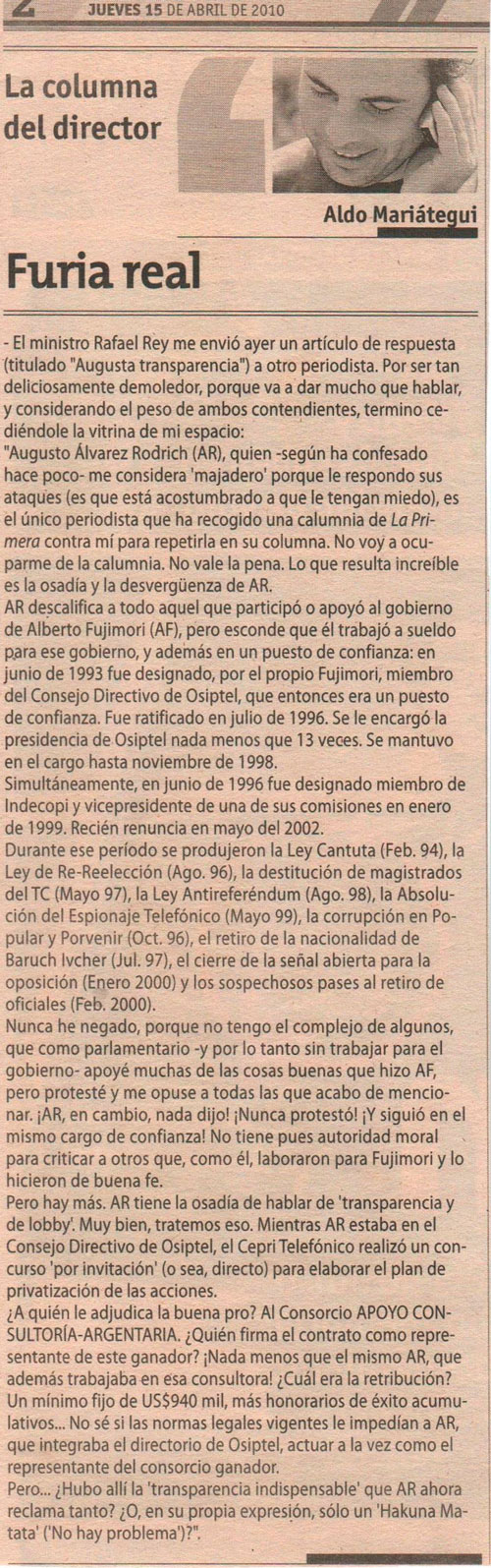 Furia Real (Augusta transparencia) By Rafael Rey On 15 Abril, 2010 In Augusto Alvarez Rodrich, Correo, Incoherencias, Libertad de expresión Previous Qué pena!! Next Valor Militar