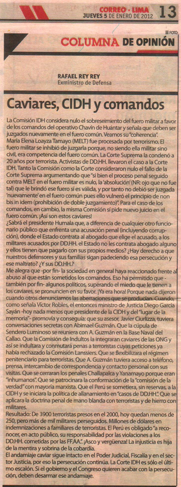 Caviares, CIDH y comandos By Rafael Rey On 5 Enero, 2012 In Corte Interamericana de DDHH, Estado y fuerzas armadas, Incoherencias, Injusticia Previous Dos agresiones a la fe, en el año de la fe Next Carta al Presidente Humala